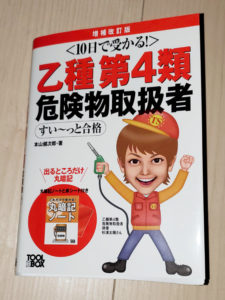 私は、まず「10日で受かる!乙種第4種危険物取扱者すい〜っと合格」という本を購入しました。理由は、ほかの参考書と比べ、評価が高く、「10日で受かる!」 というキャッチフレーズが今の自分に最適だと思ったからです。